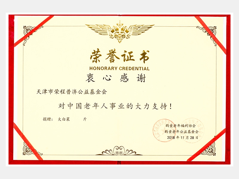 “购滞销蔬菜捐赠养老院福利院活动”天津美福安老中心荣誉证书(慈善)