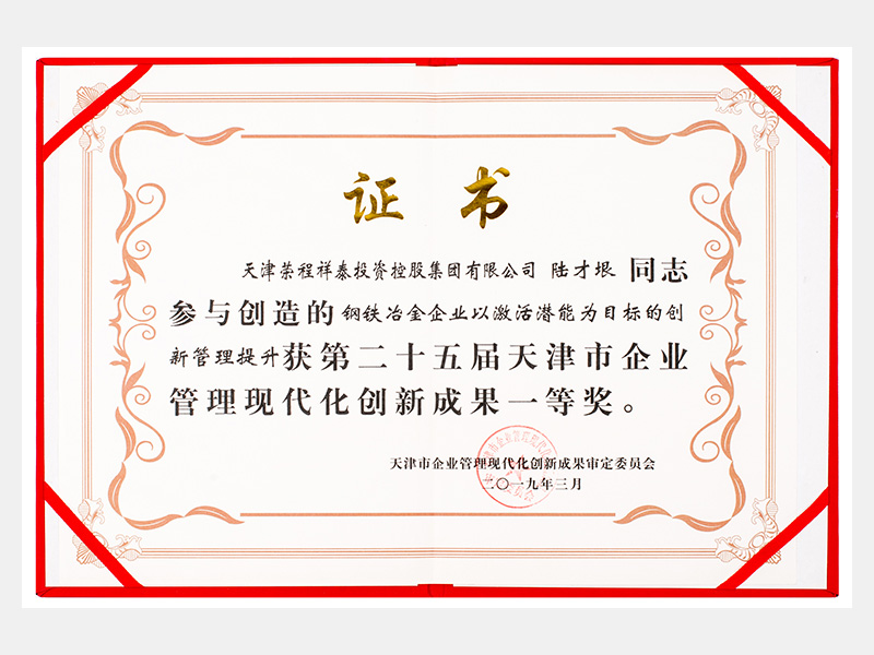 陆才垠同志参与创造的钢铁冶金企业以激活潜能为目标的创新管理提升获第二十五届天津市企业管理现代化创新成果一等奖。