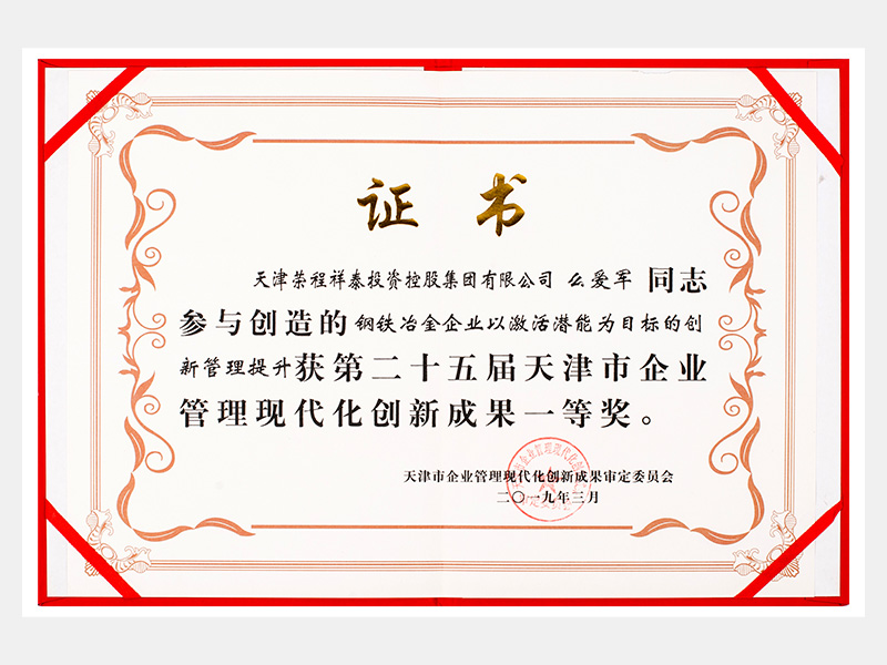 : 刘刚同志参与创造的钢铁冶金企业以激活潜能为目标的创新管理提升获第二十五届天津市企业管理现代化创新成果一等奖。