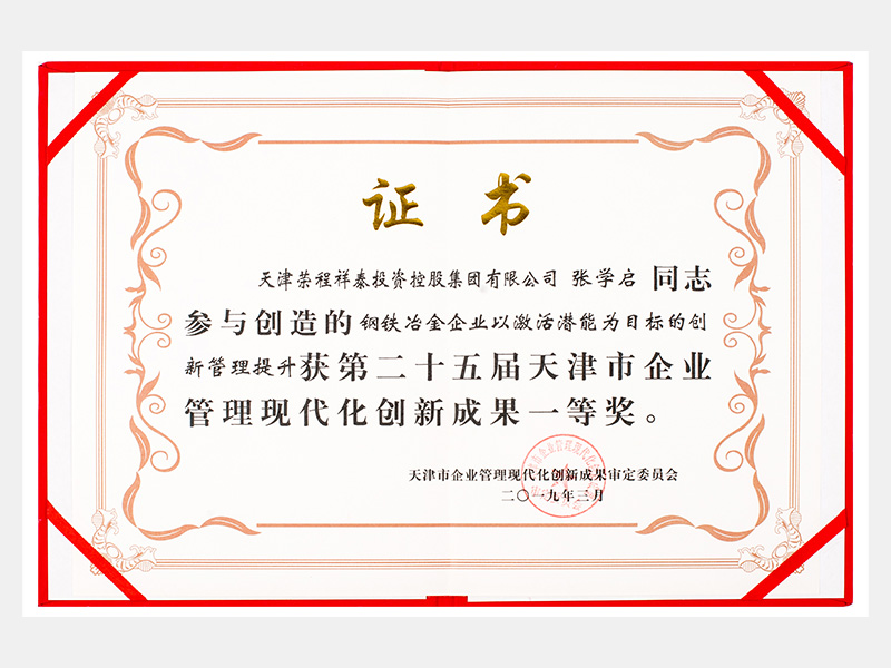 张学启同志参与创造的钢铁冶金企业以激活潜能为目标的创新管理提升获第二十五届天津市企业管理现代化创新成果一等奖。