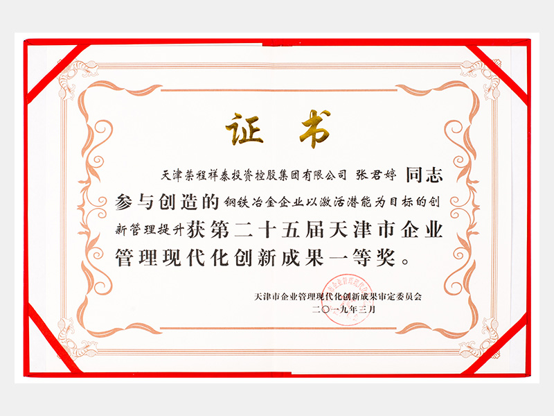 张君婷同志参与创造的钢铁冶金企业以激活潜能为目标的创新管理提升获第二十五届天津市企业管理现代化创新成果一等奖。