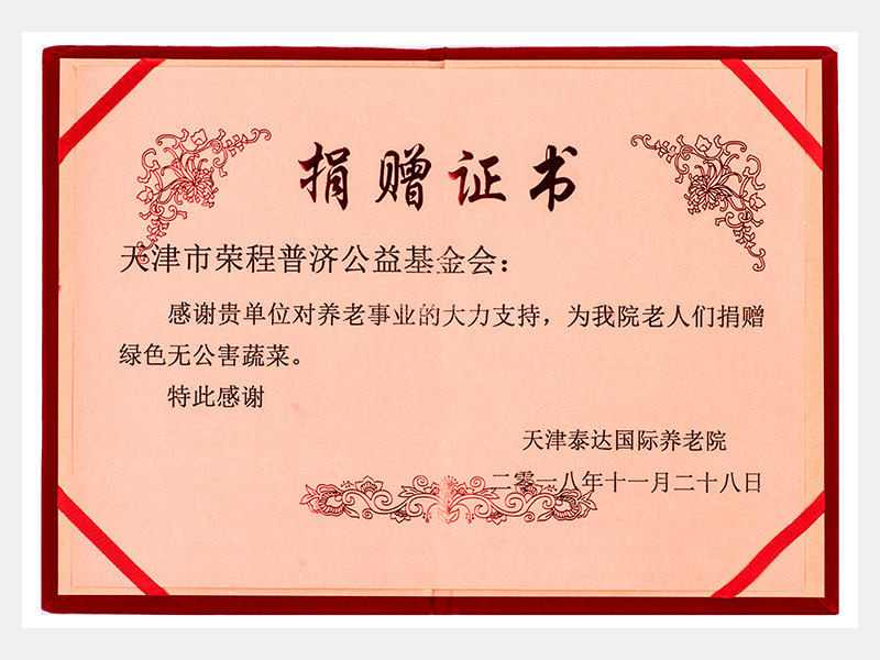 天津泰达国际养老院感谢捐赠证书(慈善)