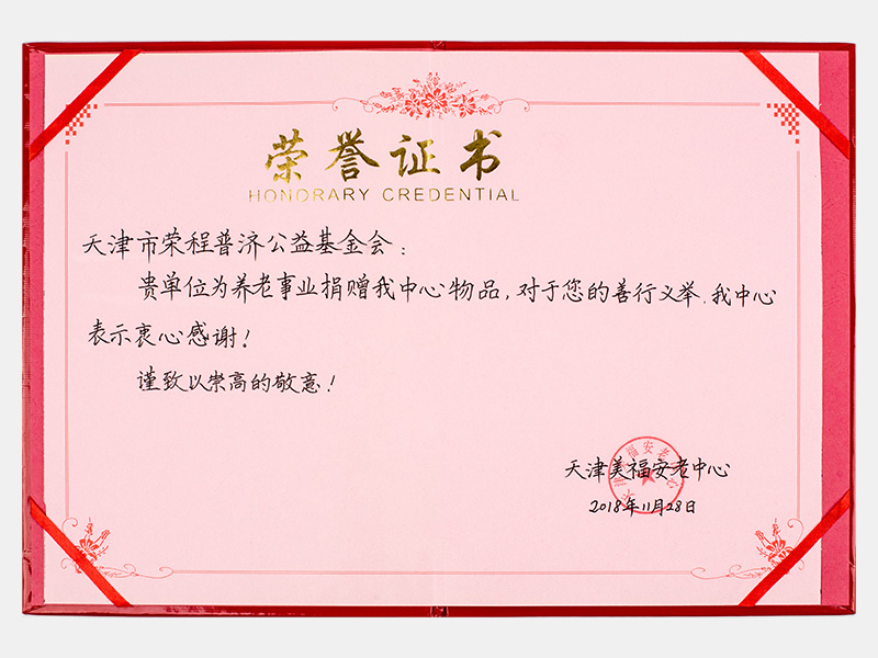 “购滞销蔬菜捐赠养老院福利院活动”天津美福安老中心荣誉证书(慈善)