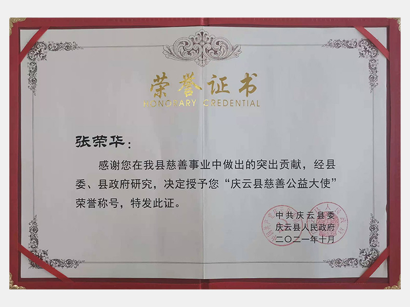 感谢您在我县慈善事业中做出的突出贡献,经县委、县政府研究,决定授予您“庆云县慈善公益大使”荣誉称号